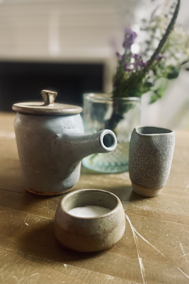 A handless teapot made with finger dimples. This tea-set is inspired by traditional Japanese pottery. The pieces are made on the wheel but tarnished and stressed using ancient techniques. The pieces have been finished in a Stoneware blue-green glaze. This is one of my favourite items I have ever made.